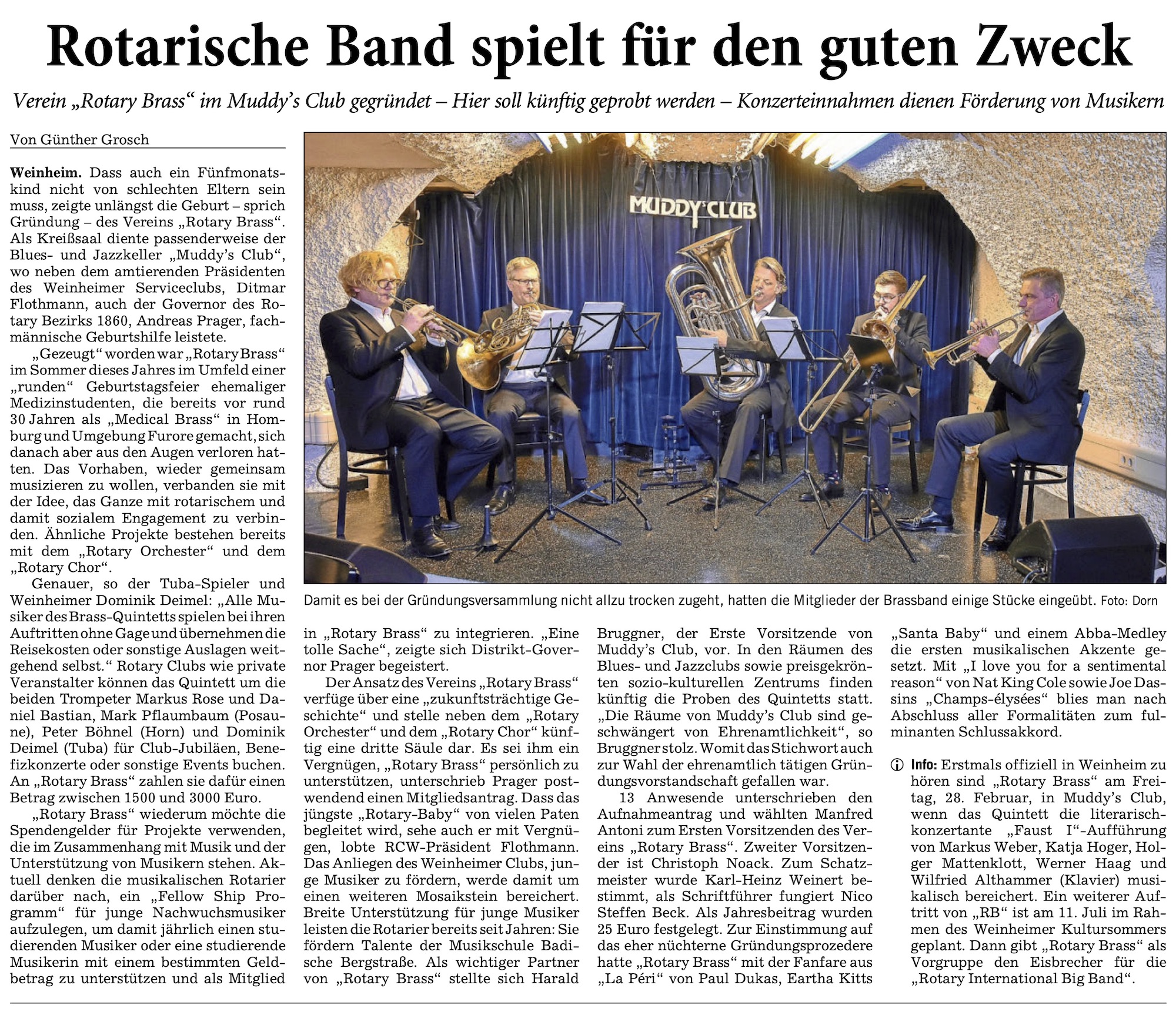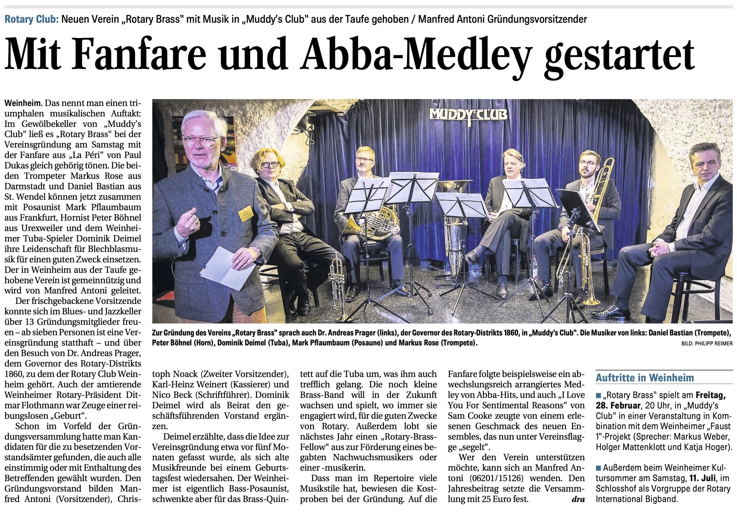 „Dass auch ein Fünfmonatskind nicht von schlechten Eltern sein muss, zeigte unlängst die Geburt – sprich Gründung – des Vereins „Rotary Brass“. Als Kreißsaal diente passenderweise der Blues- und Jazzkeller „Muddy’s Club“, wo neben dem amtierenden Präsidenten des Weinheimer Serviceclubs, Ditmar Flothmann, auch der Governor des Rotary Bezirks 1860, Andreas Prager fachmännische Geburtshilfe leistete.“ Weiter lesen…