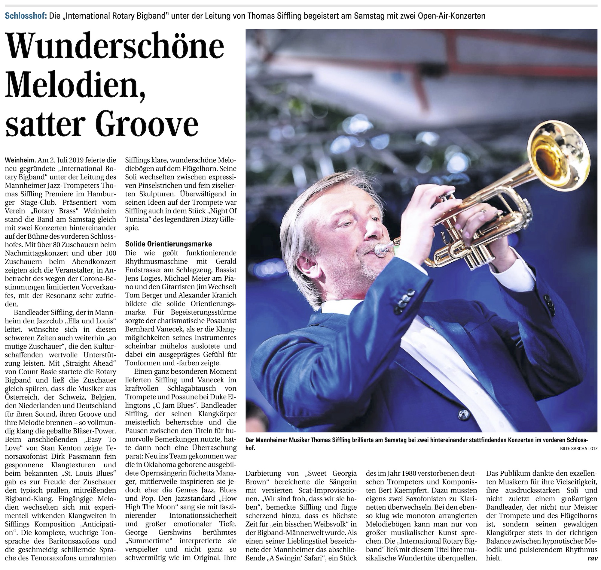 „Am 2. Juli 2019 feierte die neu gegründete „International Rotary Bigband“ unter der Leitung des Mannheimer Jazz-Trompeters Thomas Siffling Premiere im Hamburger Stage-Club. Präsentiert vom Verein „Rotary Brass“ Weinheim stand die Band am Samstag gleich mit zwei Konzerten hintereinander auf der Bühne des vorderen Schlosshofes.“ Weiter lesen…